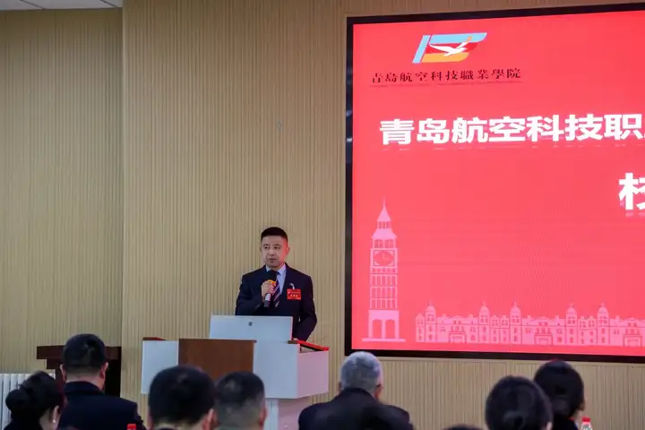 青岛航空科技职业学院校长曹青代表学校作了《2024年度学校工作报告》,系统总结了学校过去一年的工作成绩与经验,特别是在党建与思想政治工作、立德树人根本任务落实、教育教学改革创新等方面实现的新突破、新跃升。深刻分析了当前面临的机遇与挑战,明确提出了未来的发展思路和主要任务。他指出,2025年是全面贯彻全国教育大会精神、落实教育强国建设规划纲要的关键之年,也是“十四五”规划收官和“十五五”规划谋划之年,要全面贯彻党的教育方针,主动融入国家发展战略,牢牢锚定高质量发展目标,科学谋划并扎实推进学校“十五五”发展规划编制与实施工作。全体教职工要凝心聚力、同心同德、迎难而上、开拓创新,奋力谱写青岛航空科技职业学院高质量发展的新篇章。