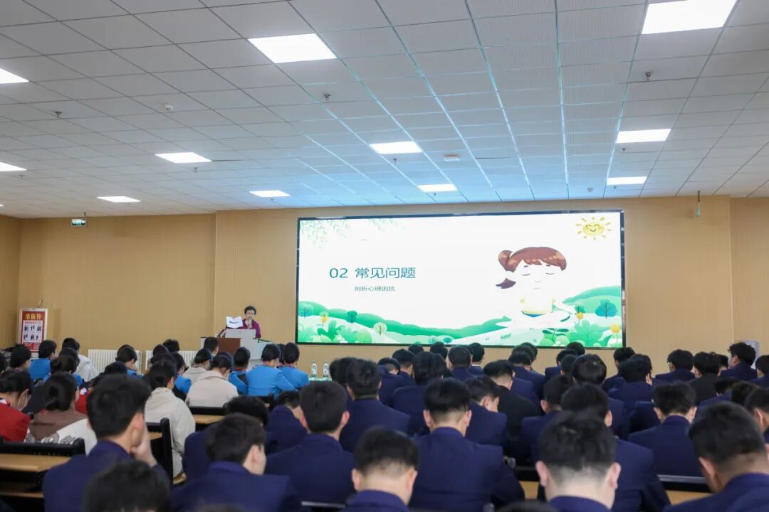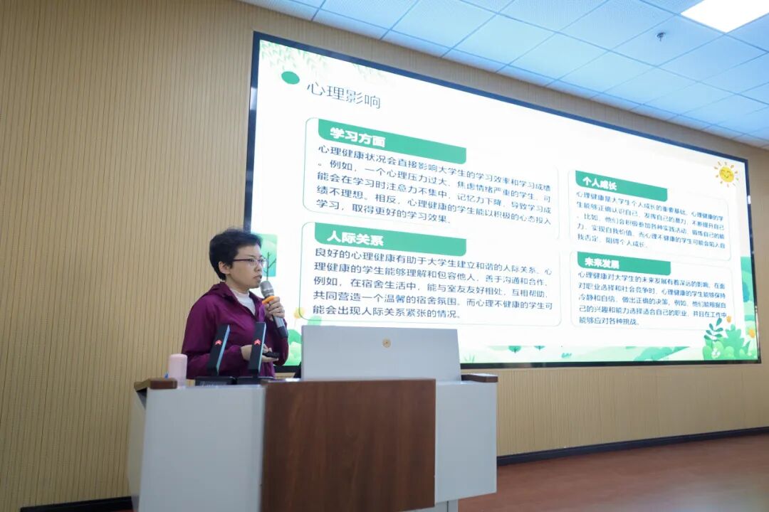 讲座现场,王昕主任医师凭借深厚的专业知识和25年丰富的临床工作经验,将心理健康知识围绕学业、人际关系、职业选择等内容转化为一个个生动有趣的案例和通俗易懂的讲解。从情绪管理的艺术,到压力应对的有效策略,再到人际支持中的沟通方式,每一个话题分享的内容实用细致,在场师生均感到受益良多。