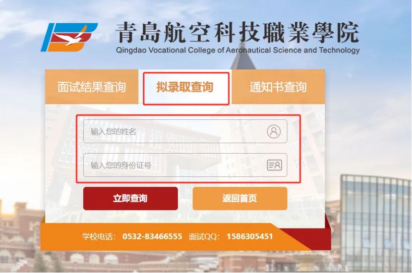 登录青岛航空科技职业学院官方网站:https://www.qdhkxy.com/query.html点击招生录取查询,输入姓名及身份证号码查询。