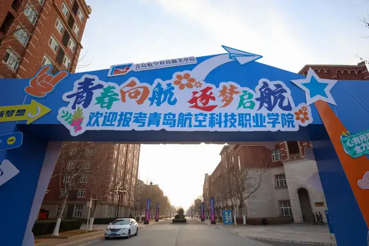 路旗迎风招展,西校门内蓝白主调的欢迎拱门矗立,与校徽色彩呼应,传递着“青航等你”的热忱。