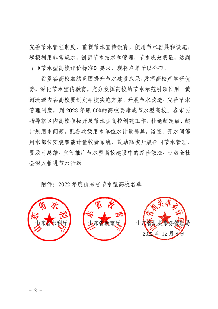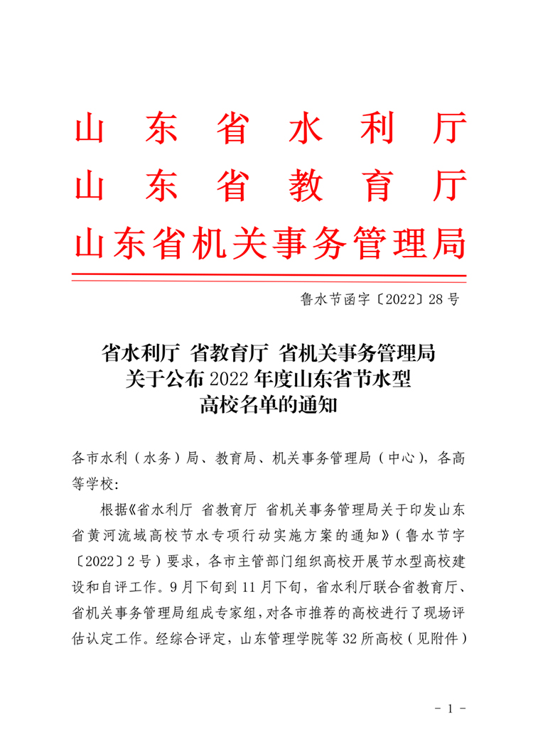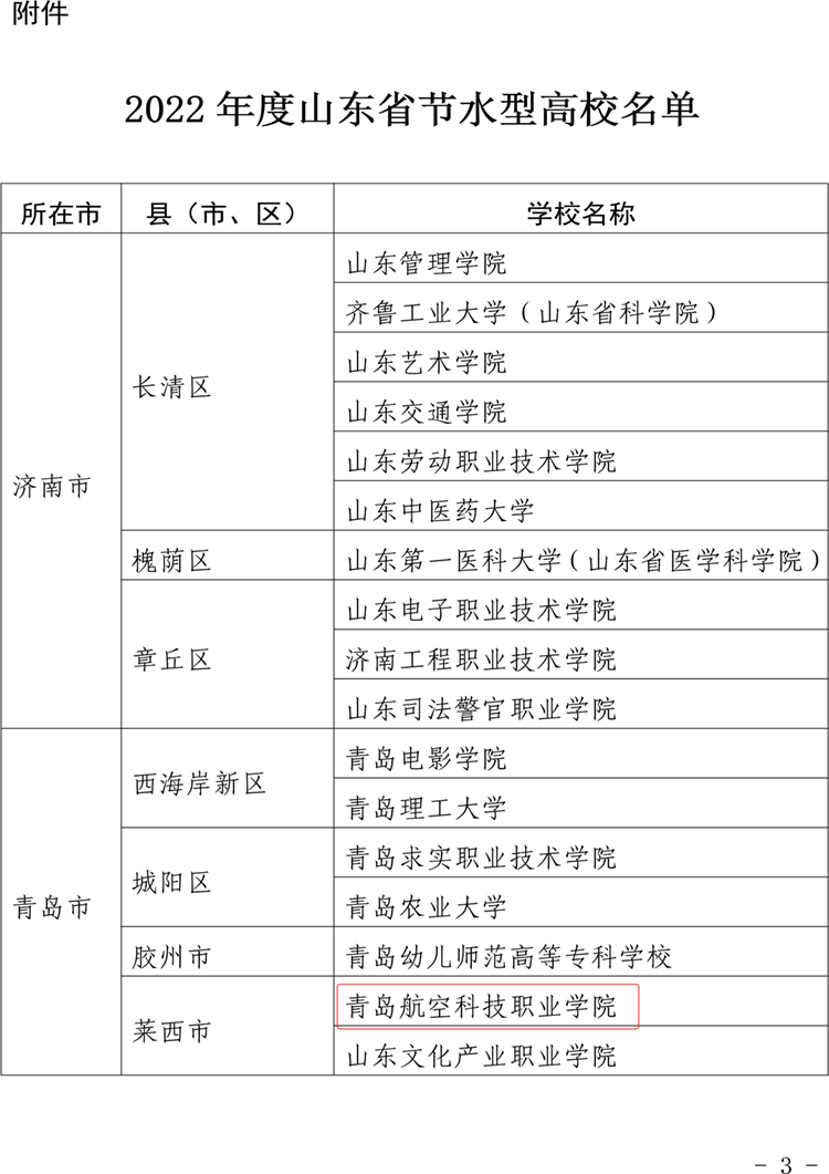 近日,根据《山东省水利厅 省教育厅 省机关事务管理局关于印发山东省黄河流域高校节水专项行动实施方案的通知》(鲁水节字〔2022〕2号)部署,经过综合评定,青岛航空科技职业学院被认定为2022年度“山东省节水型高校”。
