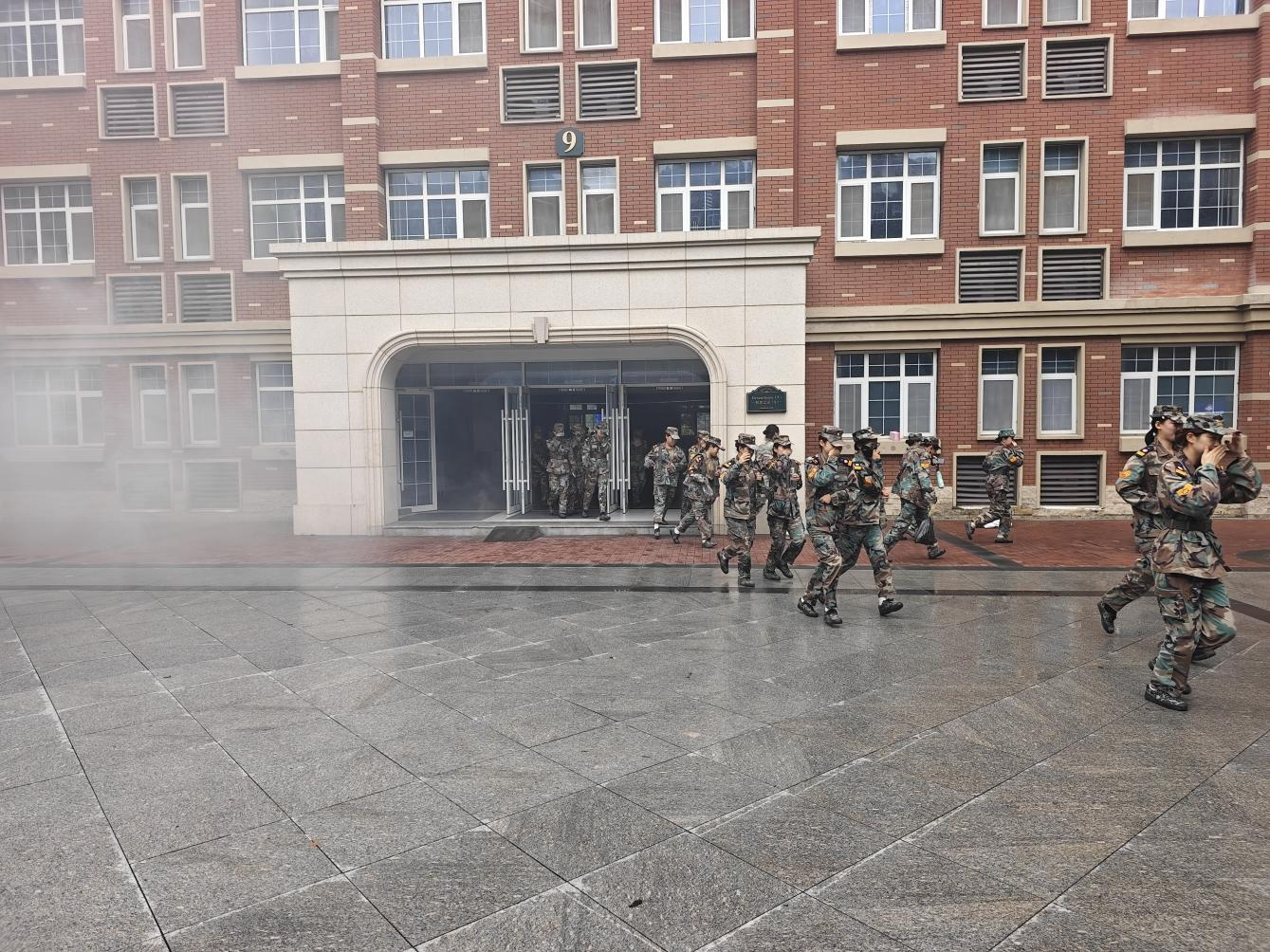演练开始,安保人员点燃发烟饼模拟火灾场景,伴随紧急哨声,学生按在老师的指挥下按“先低后高、先近后远”原则低姿撤离,快速到指定点位集结。军体处副处长刘克刚对演练讲评,肯定整体效果并指出细节问题,要求学生将演练技能融入日常,强化安全意识。