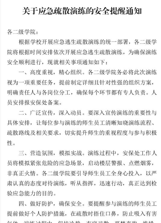 演练前,学校安保处精心策划演练方案、明确疏散路线与人员分工,各二级学院通过班会、微信群等方式开展专项安全教育。