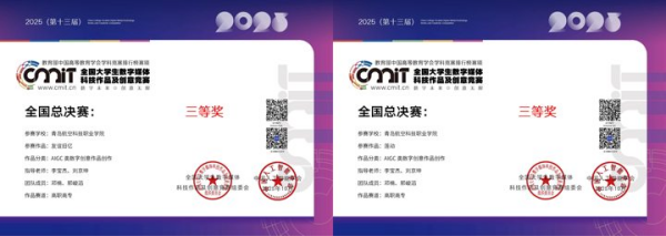 近日,由中国人工智能学会主办的第十三届全国大学生数字媒体科技作品及创意竞赛全国总决赛圆满落幕。青岛航空职业技术学院信息工程学院学子不负众望,在虚拟现实教研室李宝杰老师的悉心指导,以及学院负责人刘京坤的参与支持下,奋勇拼搏、捷报频传,最终斩获全国总决赛三等奖2项、山东赛区二等奖2项、山东赛区三等奖2项,用实力彰显了学院学子的专业素养与创新能力。
