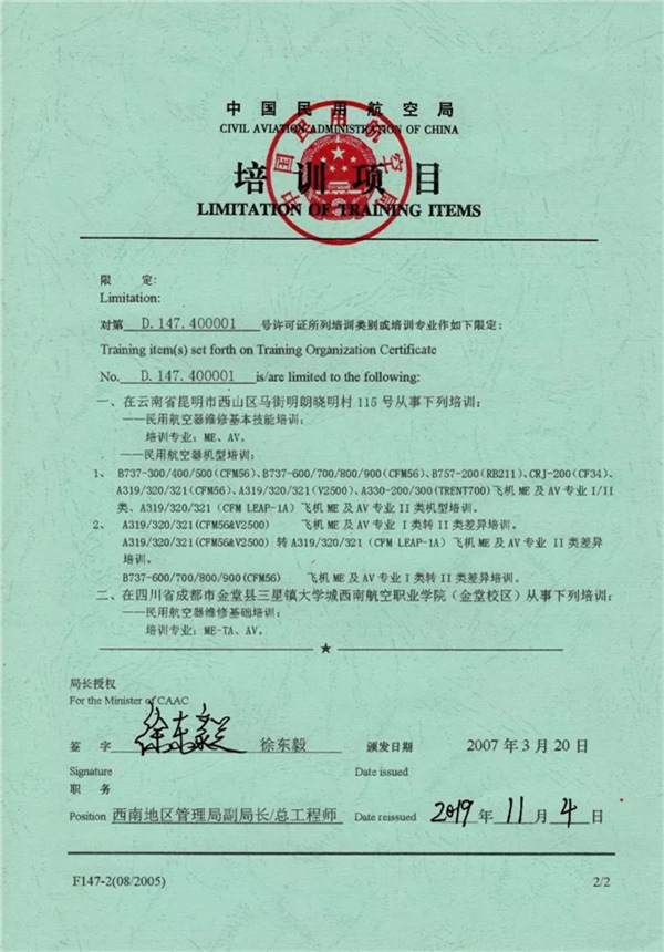 目前,其分别在云南及四川省设立培训基地,可同时开展基本技能培训(ME/AV专业)、维修基础培训(ME-TA/AV专业)、机型培训项目(现具备B737CL、B737NG、B757-200、空客A320系列、A330-200/300、CRJ-200、PA-28等机型的培训资质,几乎涵盖了所有的现役主流机型)。其年平均培训人次约1500人次,自成立以来已先后培训10000万人余人次,在同行业中的培训规模系全国前列。