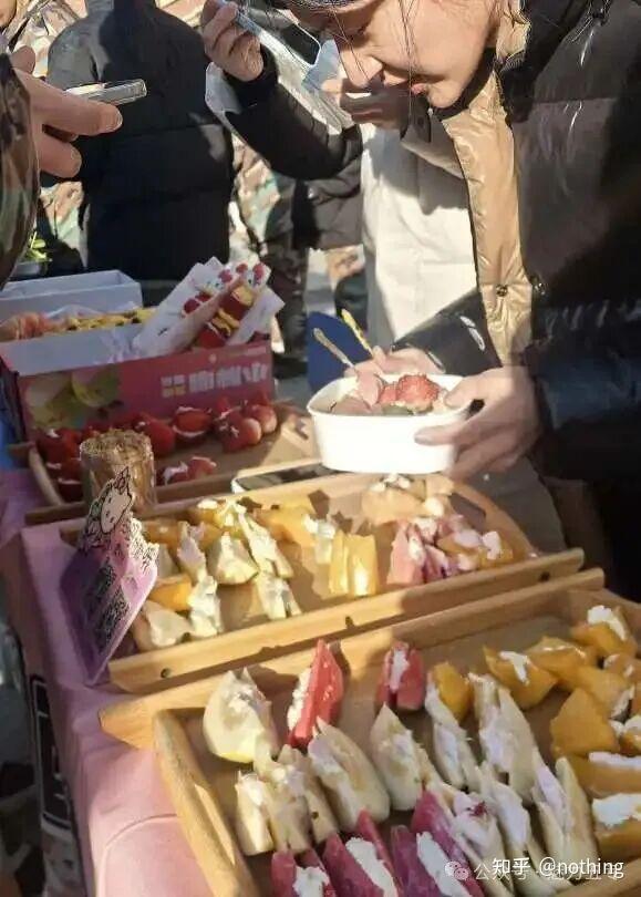 新鲜的水果块被满满地夹在浓稠丝滑的酸奶里,每一块果肉都裹上了淡淡的奶香。入口先是酸奶的醇厚清甜,紧接着是水果的清爽汁水在舌尖迸发,酸甜交织的口感,清爽又解腻,咬上一口,满是清新的滋味,而网红的固体杨枝甘露凭借绵密扎实的质地,复刻了杨枝甘露的经典风味。芒果的香甜、西柚的微酸、椰奶的醇厚完美融合,每一口都能尝到丰富的层次感。入口软糯又带着一丝嚼劲收获了无数前来购买的师生。