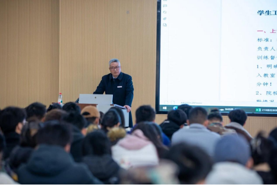 吴颖军副校长围绕班级学风班风建设、课余活动人才培养体系建设、大学生体质提升、校园文明礼仪和大学生修养,在十三个方面对本学期的学生工作提出了具体目标,并讲解说明工作方式。