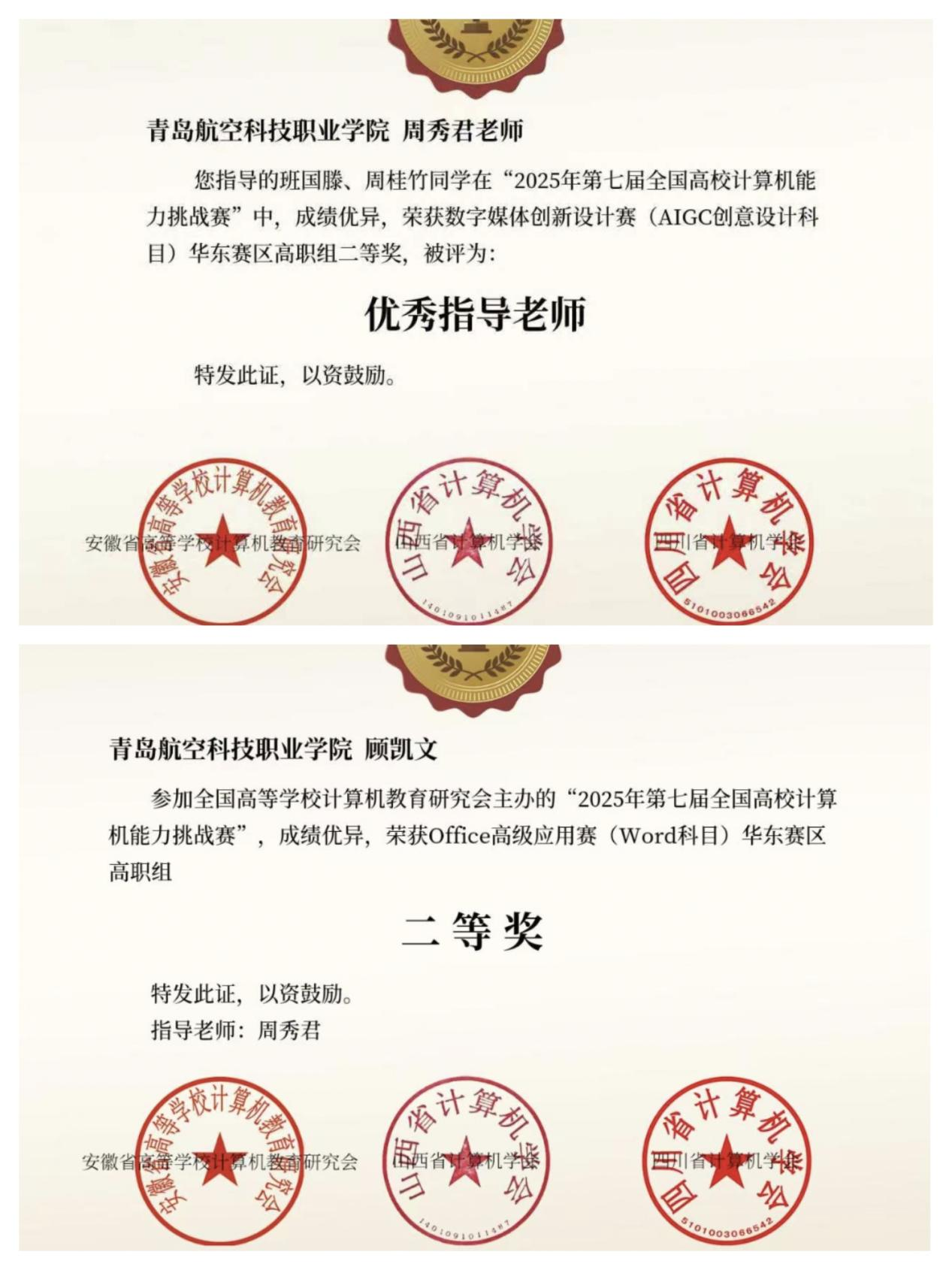 经过层层比拼,学院参赛团队最终斩获华东赛区省级二等奖2项、全国三等奖2项,其中office高级应用赛与数字媒体创新设计赛各收获省级二等奖1项、全国三等奖1项;周秀君老师凭借专业的指导水平、严谨的教学态度,以及在赛事指导中的突出表现,荣获“优秀指导教师”称号。