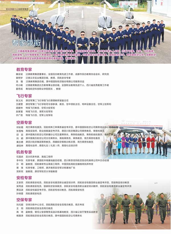 学院高薪聘请了一大批经验丰富的民航行业专家、航空院校专家教授、学术技术带头人,组建了包括飞行、空乘、空保、飞机维修、民航安检等专家团队,重视双师型师资队伍建设。